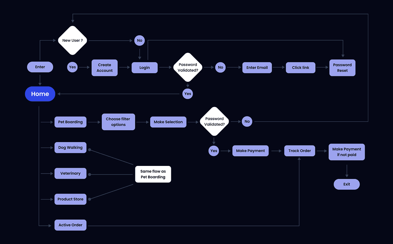 From there, I translated those insights into an interaction framework. The goal was to create a unified experience where booking services, purchasing products, and managing pet health felt connected and seamless.